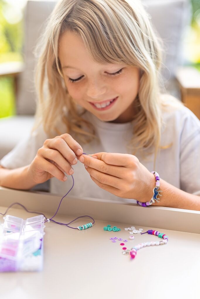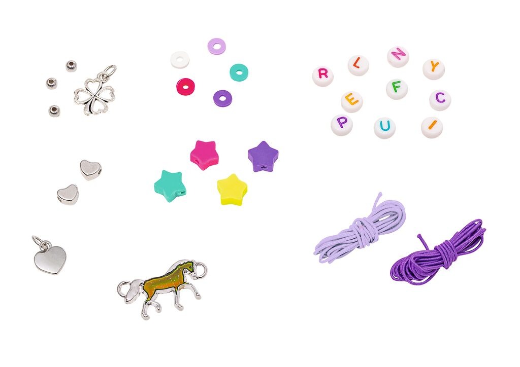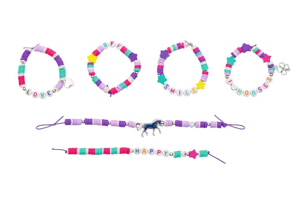 Das Perlsenset "Stimmungsarmband Pferde" ist das ideale Geschenk für alle Pferdefans und kreative Köpfe. Der coole Pferde-Stimmungsanhänger kann mit zahlreichen farbenfrohen Buchstabenperlen und Sternen geschmückt werden. Die bunten Buchstabenperlen bilden Worte wie Love, Horses, Smile, Happy, BFF, Friends, Nice, My Pony und Lucky. Das Set ist perfekt für einen kreativen Nachmittag mit Freund*innen, bei dem jede Person ihr eigenes, individuelles Armband gestalten kann.