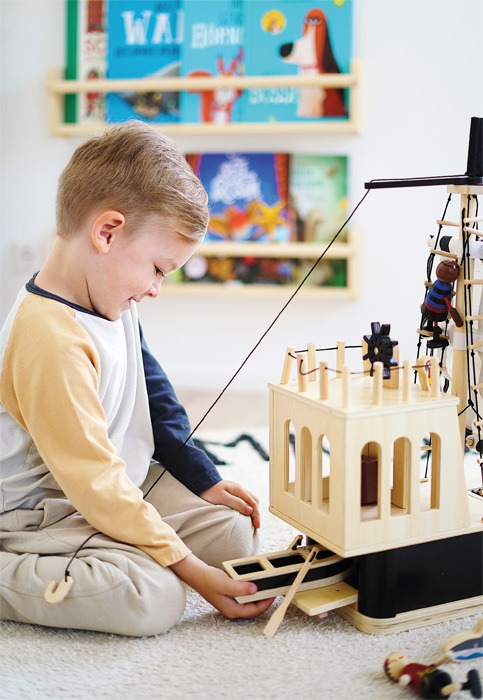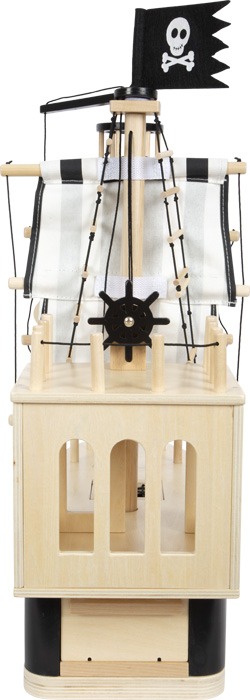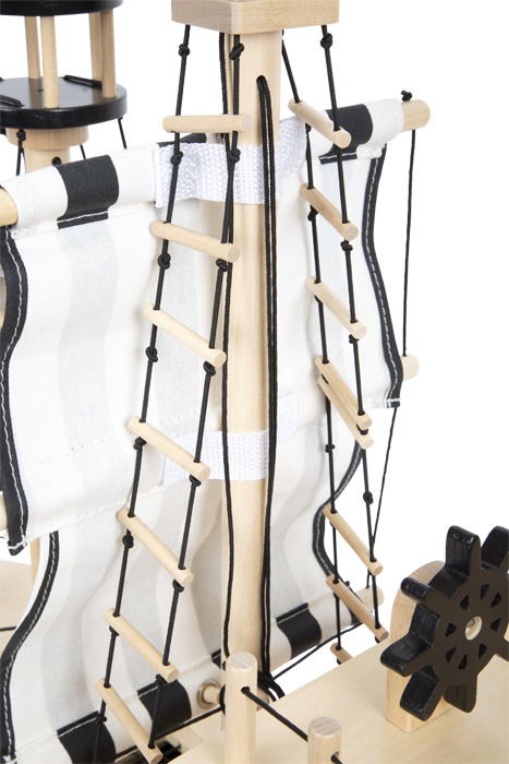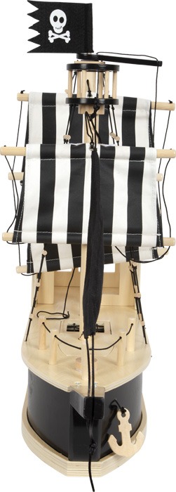 Ahoi ihr Seeräuber! Dieses detailreich gestaltete Piratenschiff aus robustem Holz lässt mit seinen vielen authentischen Details keine Wünsche offen! Das umfangreiche Spielset umfasst neben dem geräumigen Zweimaster auch ein Beiboot zum Rudern für zwei Biegepuppen, einen Hai, einen Papagei, eine Schatzkiste, eine Kanone sowie zwei Fässer, eine Planke und natürlich eine Piratenflagge. Wie bei einem echten Segelschiff lassen sich alle Segel an Seilen hissen und bergen. Für die Extraportion Spielspaß sorgt die Kanone, die ihre drei Kanonenkugeln aus Filz durch die Luft fliegen lässt!