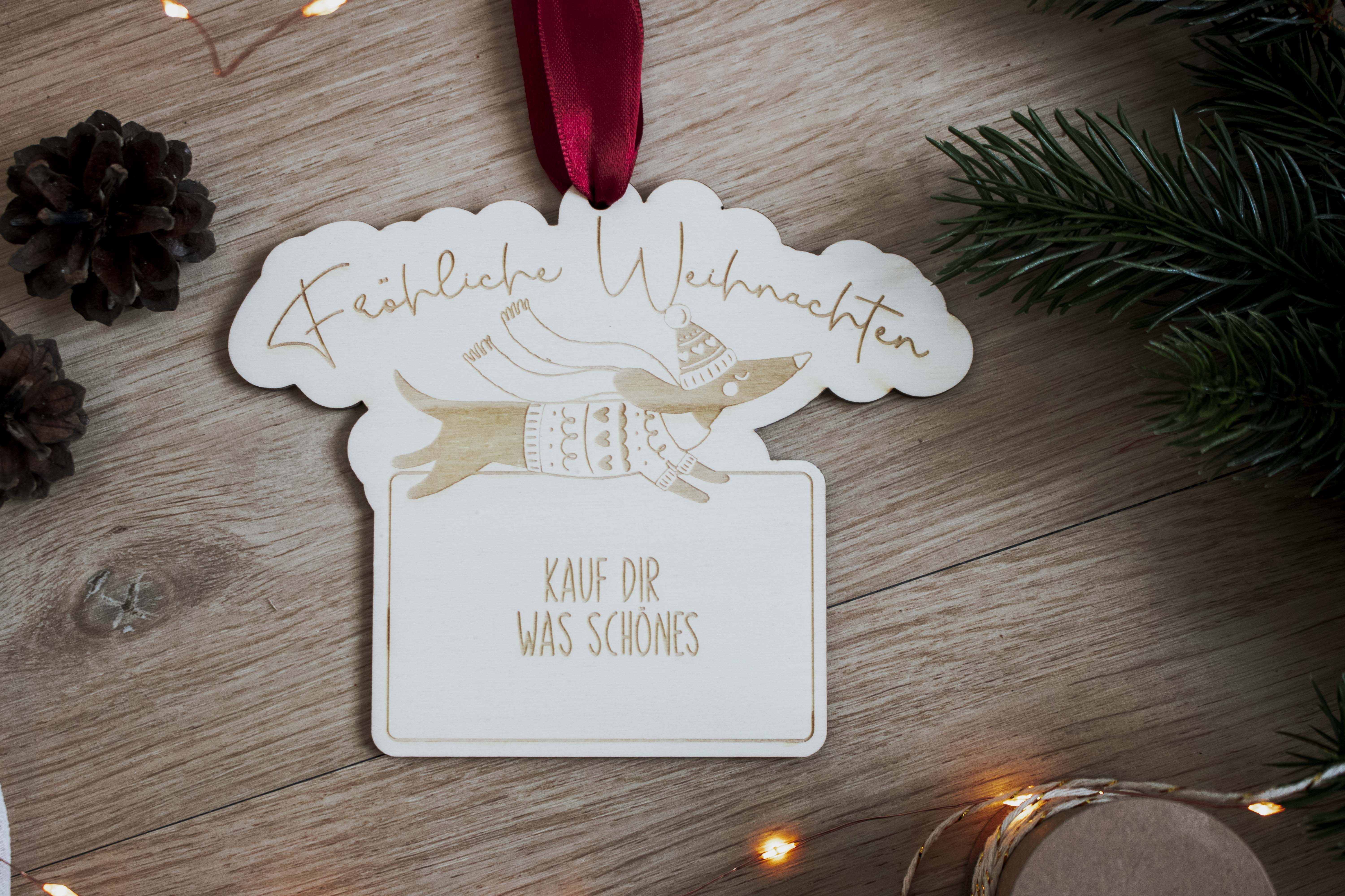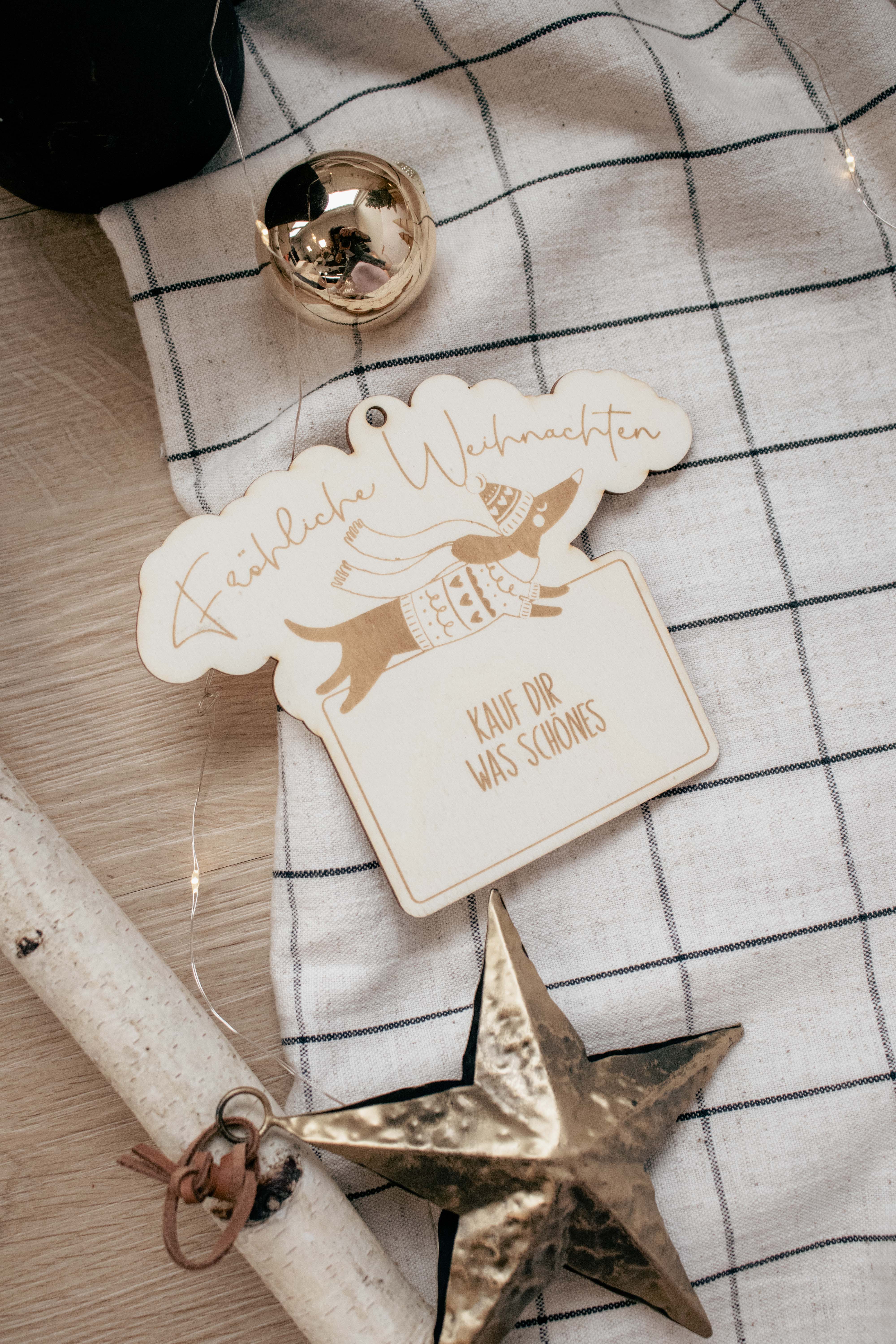 Unser kleiner Dackel ist die perfekte Geschenkverpackung für Unentschlossene. Auf ihm ist nämlich Platz für einen Geschenkgutschein.