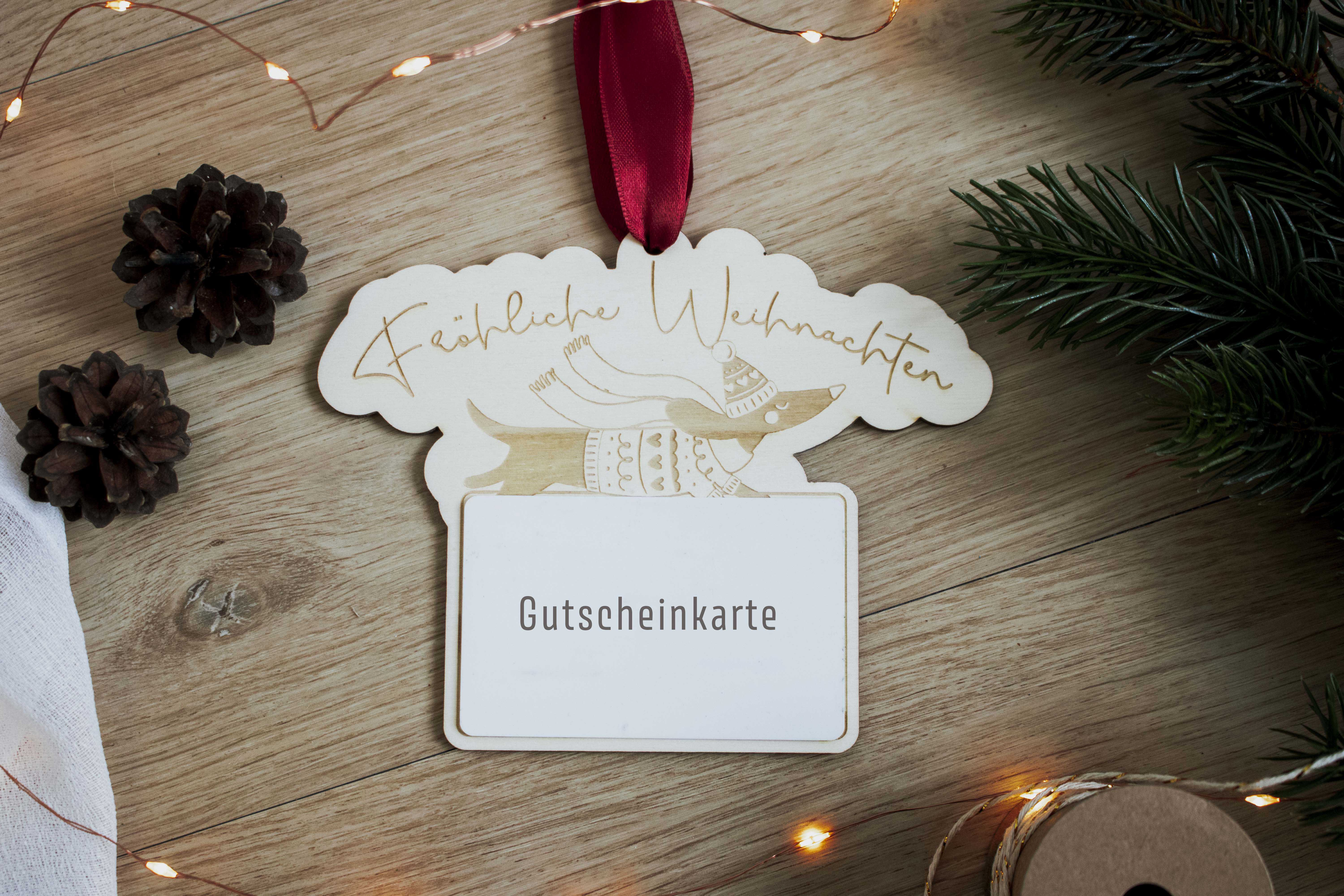 Die Gutscheinkarte kann unt dem Dackel mit doppelseitigem Klebenband aufgeklebt werden. Dieses ist im Umfang inklusive.